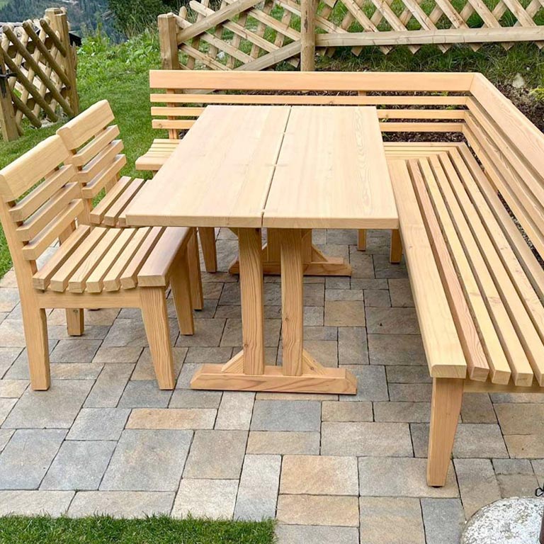 Langlebige Outdoor-Gartenmöbel aus Vollholz sehen nicht nur gut aus, sondern sind auch ein Stück österreichische Tradition. Als Gartenmöbel-Hersteller aus Österreich fertigen wir preiswerte Gartenmöbel-Sets aus Lärchenholz, Tannenholz, Gebirgstanne sowie Eichenholz. Eine Eckbank für Ihre Terrasse lädt zum gemütlichen zusammen sitzen ein, und kann nach Kundenwunsch maßangefertigt werden. Auch ein Hausbankerl oder Sunnbankerl genannt, kann zum gemeinsamen Plaudern vor der Haustüre einladen. Entdecken Sie die Möglichkeiten in unserer Galerie.