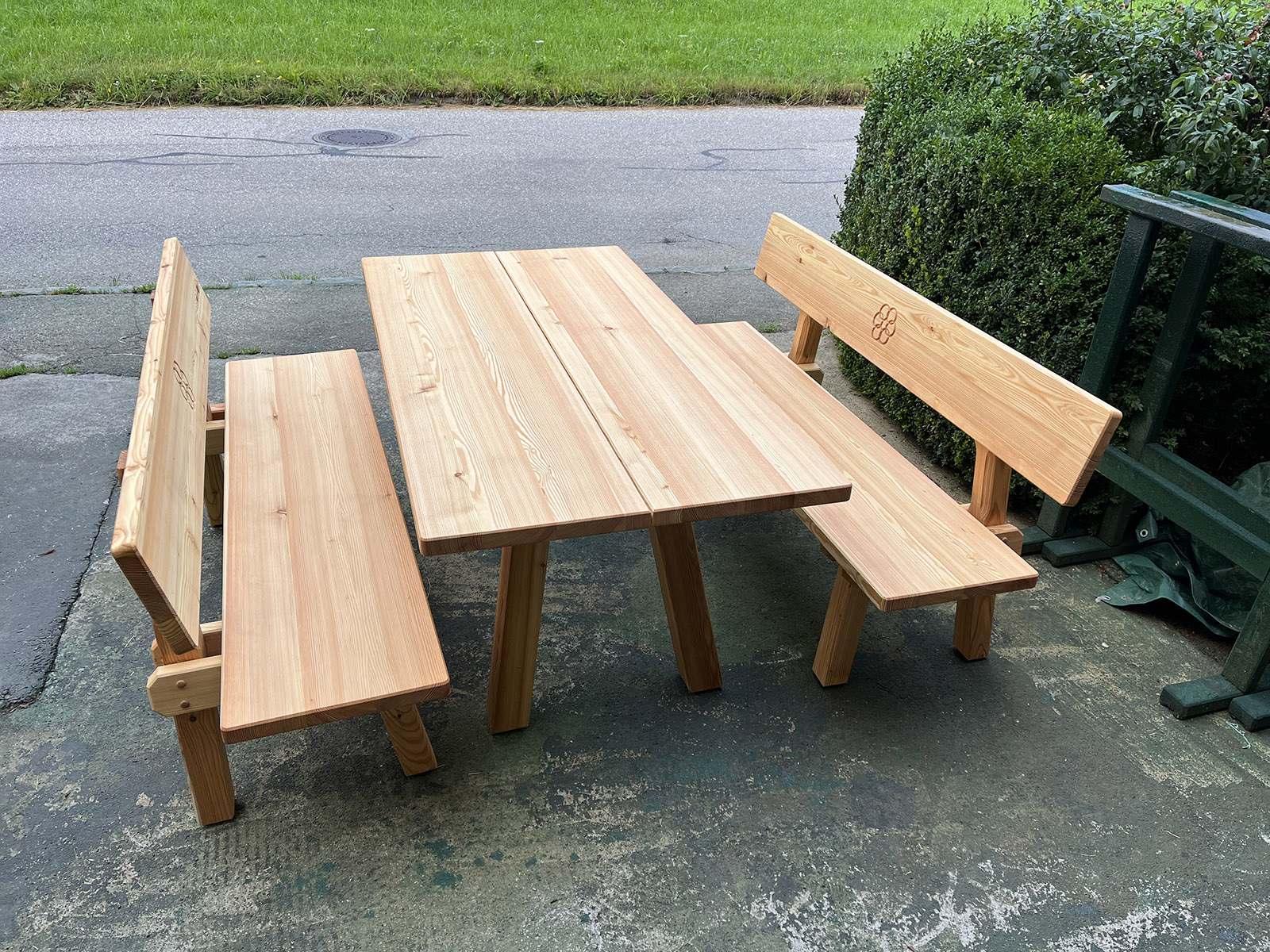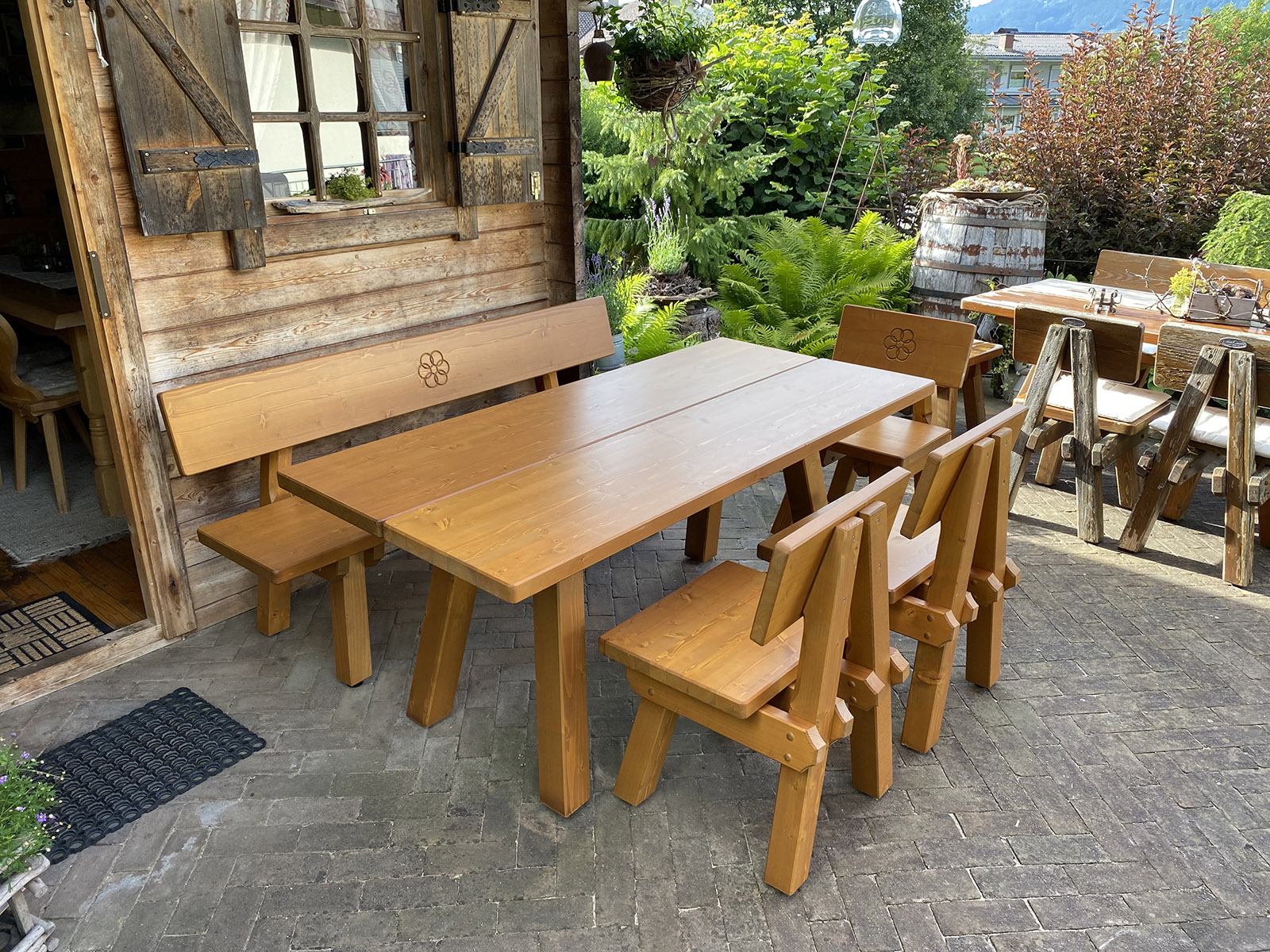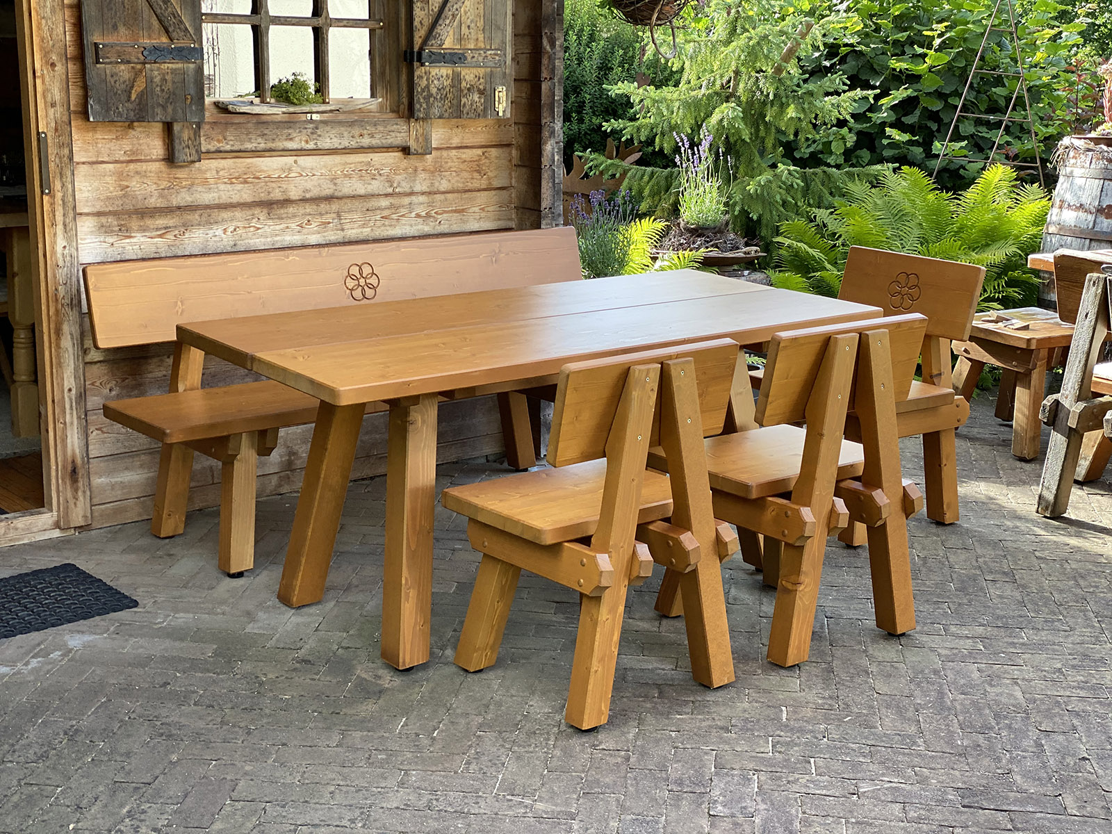 Tische, Eckbänke, Sitzbänke, Sessel, Hausbankerl für Terrasse, Garten und Balkon aus der Kollektion Landhaus. Hergestellt von der Tschlerei Hemtsberger.