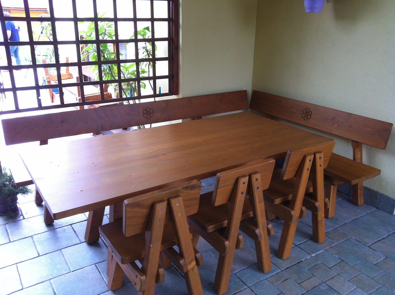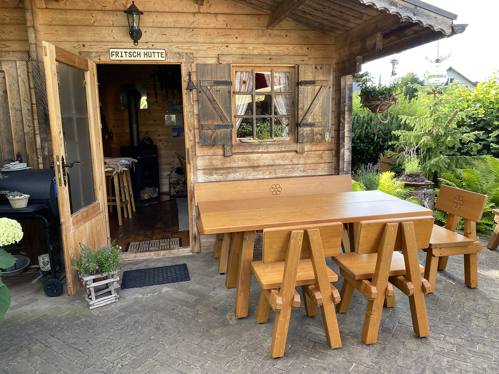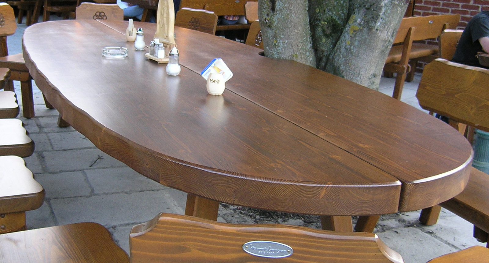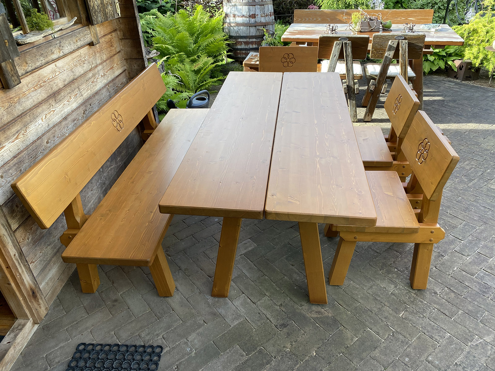 Tische, Eckbänke, Sitzbänke, Sessel, Hausbankerl für Terrasse, Garten und Balkon aus der Kollektion Landhaus. Hergestellt von der Tschlerei Hemtsberger.